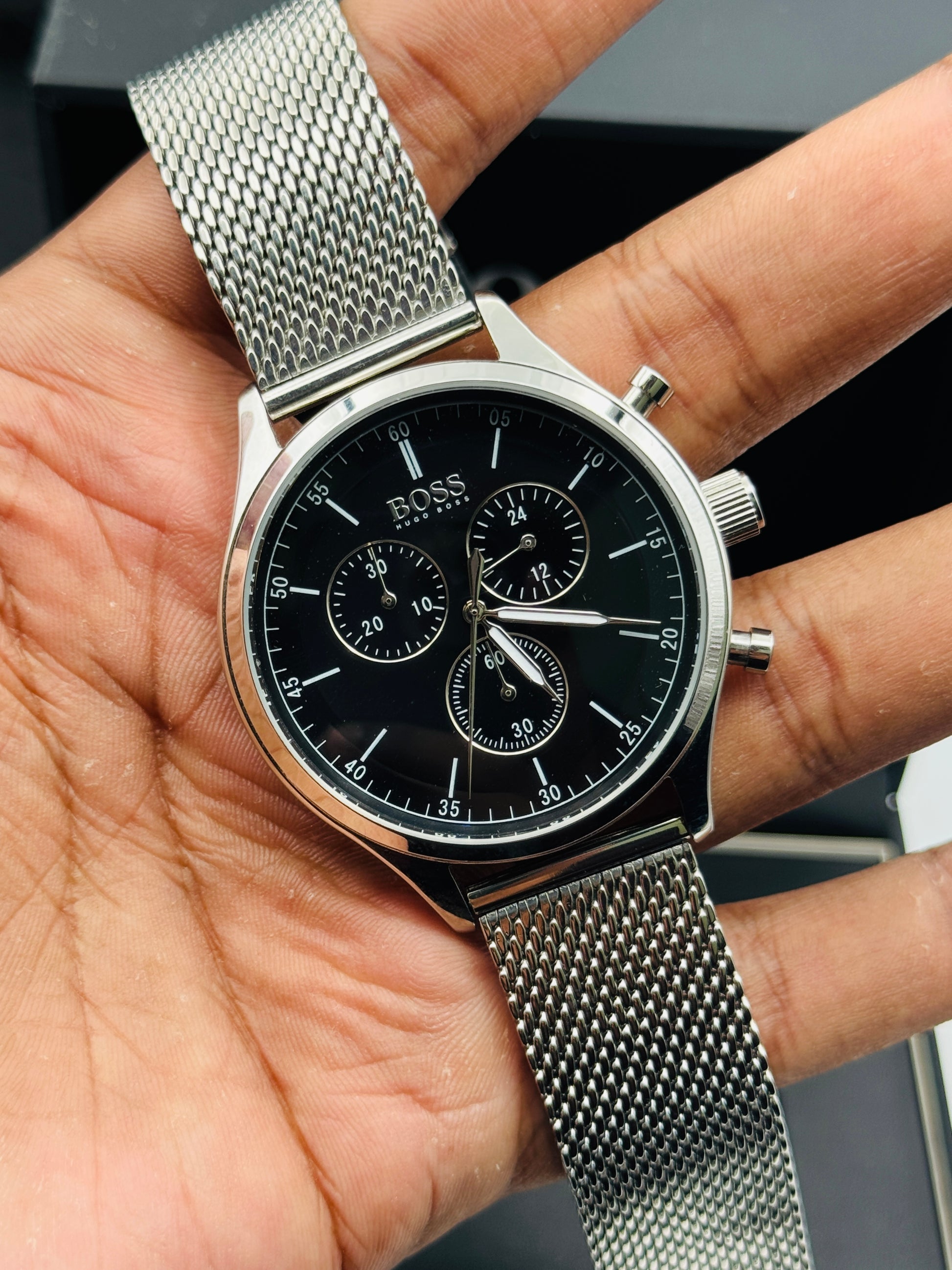 This Hugo Boss timepiece exudes luxury with its elegant rose gold finish and beautifully matched mesh bracelet. The striking black dial creates a bold contrast, highlighted by rose gold sub-dials and hands that add a refined, premium touch.